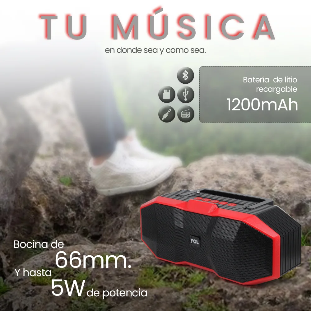 Bocina deportiva recargable con conexión bluetooth, ideal para llevar a cualquier lugar, su forma y color es más deportivo y juvenil, además su sonido es claro y sin cortes gracias a su speaker de 66mm. que brinda la potencia que necesitabas en esos eventos al aire libre.