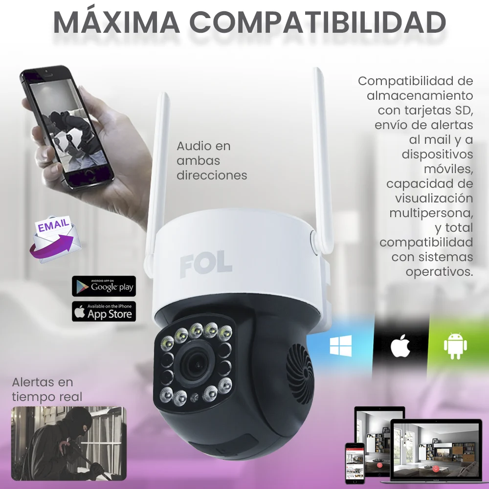 Y lo mejor de todo, nuestra cámara inteligente WIFI es compatible con dispositivos Android, Apple y Windows. Independientemente del sistema operativo que utilices, tendrás acceso y control total sobre tu cámara.
