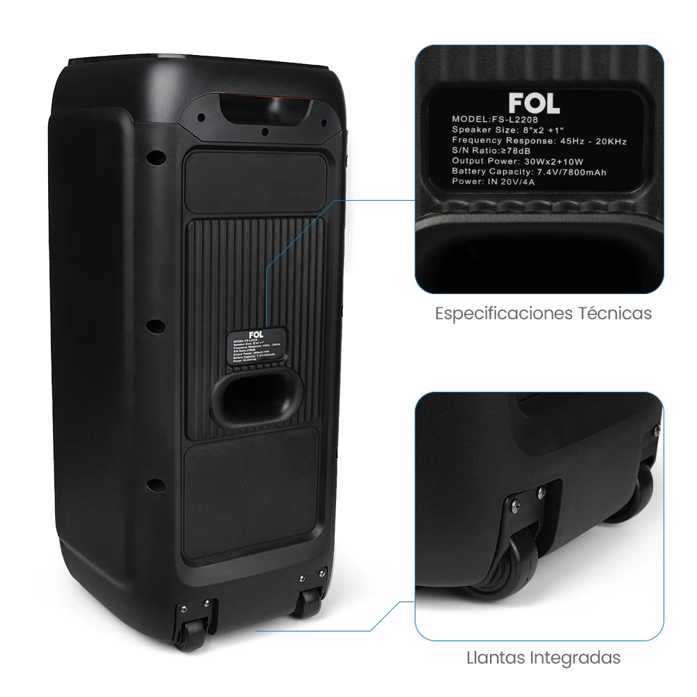 Potencia, claridad y movilidad total. Esta bocina combina dos woofers de 8″ + un tweeter de 1″ para ofrecer un sonido fuerte, definido y con buen rango. Con 70W de potencia, llena fácilmente espacios abiertos o cerrados. Su batería recargable de 7.4V/7800mAh te da horas de reproducción, y la entrada de carga DC IN 20V/4A asegura un tiempo de carga rápido y estable.