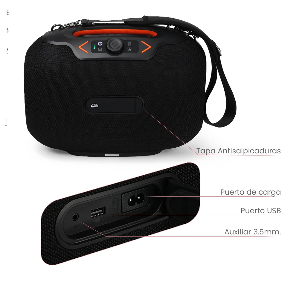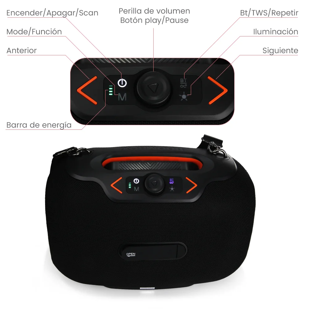 Incluye agarradera integrada y correa desmontable, facilitando su transporte y uso en cualquier lugar. Su diseño robusto se complementa con luces RGB multicolor, que aportan un estilo dinámico y moderno a cada reproducción.