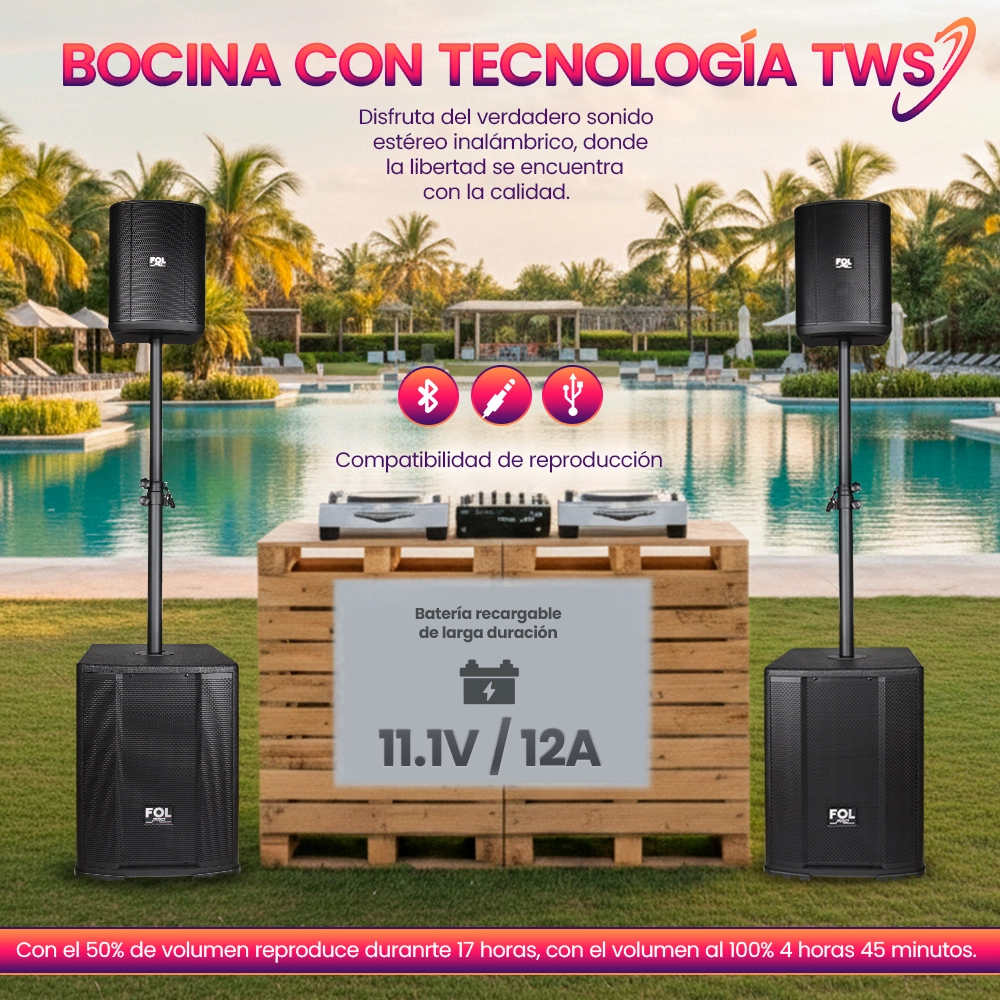 Incorpora conectividad Bluetooth para transmisión inalámbrica desde dispositivos móviles y tecnología TWS (True Wireless Stereo), que permite enlazar dos torres iguales de forma inalámbrica para crear un sistema estéreo real, separando canal izquierdo y derecho y ampliando la cobertura sonora.