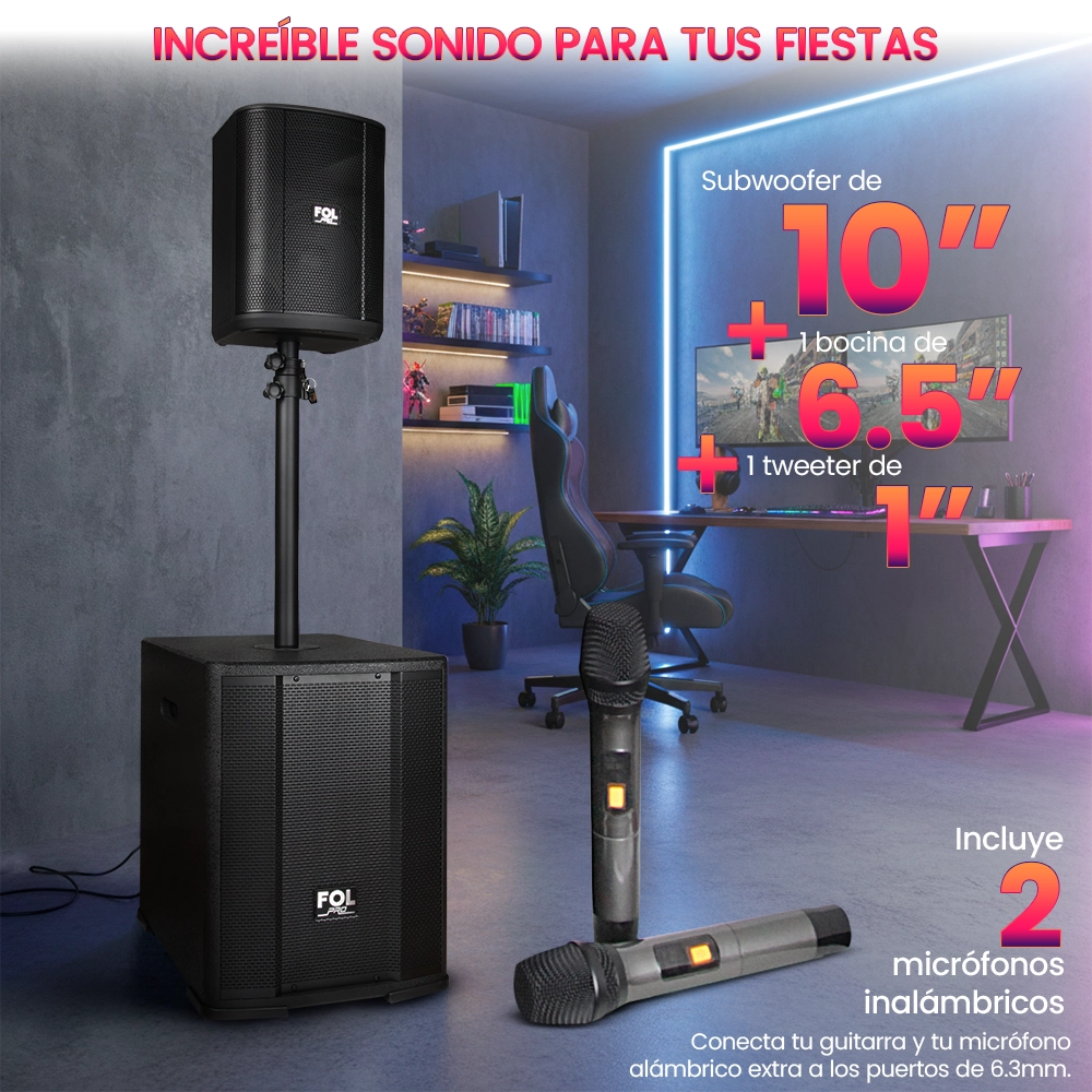 Esta torre de sonido está diseñada para ofrecer un audio potente, balanceado y versátil tanto para reproducción musical como para uso en vivo. Incorpora un subwoofer de 10 pulgadas encargado de las frecuencias graves, proporcionando bajos profundos y con buen impacto. La bocina de 6.5 pulgadas reproduce las frecuencias medias, aportando claridad en voces e instrumentos, mientras que el tweeter de 1 pulgada, que es el altavoz más pequeño del sistema, se encarga de las frecuencias altas para lograr agudos definidos y brillantes sin distorsión.
