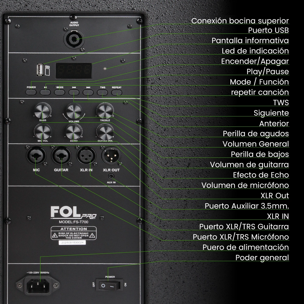 FS-T700 TORRE DE SONIDO RECARGABLE CON DOS MICRÓFONOS INALÁMBRICOS Y CONEXIONES XLR